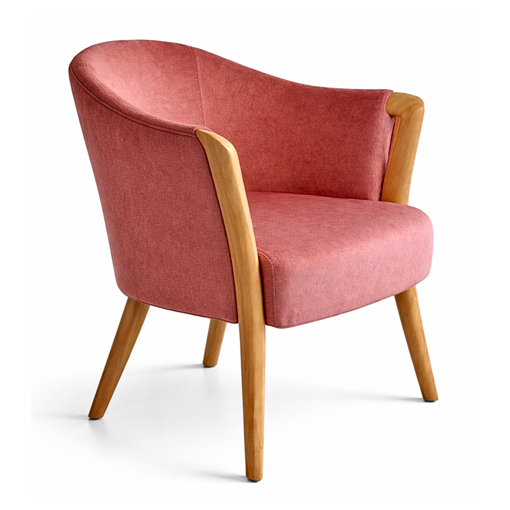 A stylish and compact lounge chair featuring soft coral brown fabric upholstery with elegant wooden arm supports and tapered legs. Designed for comfort and modern interiors.